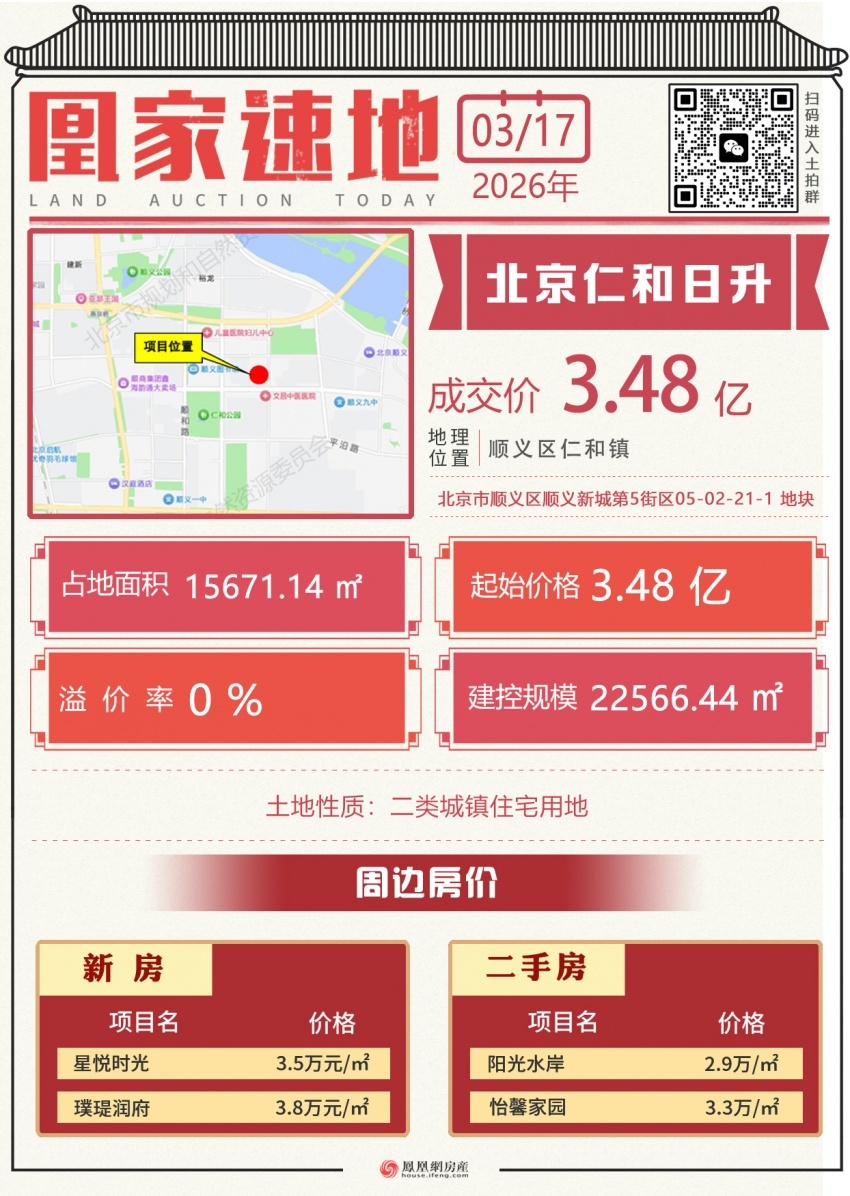截止挂牌时间结束,该地块仅获1家房企报名,最终由北京仁和日升房地产有限公司以3.48亿元底价摘得,楼面价约1.54万元/㎡。