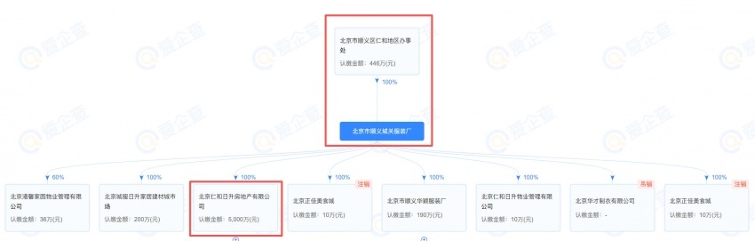 从股权穿透图可以看出,北京仁和日升房地产有限公司背后大股东为北京市顺义城关服装厂,而该服装厂背后股东则为北京市顺义区仁和地区办事处。信息显示,该公司成立于2003年12月31日,注册地位于北京市顺义区林河南大街9号院17号楼1至6层101,法定代表人为杨铂,经营范围包括房地产开发、销售自行开发的商品房、建筑材料(不含砂石及制品)、从事房地产经纪业务、物业管理等。