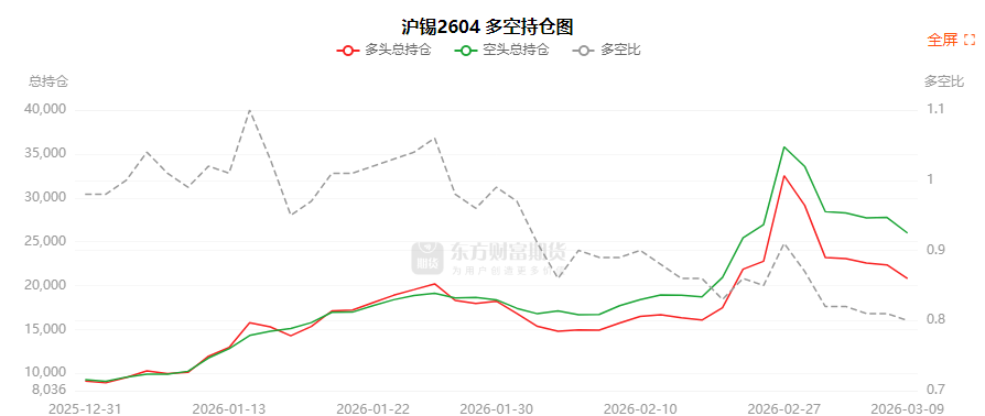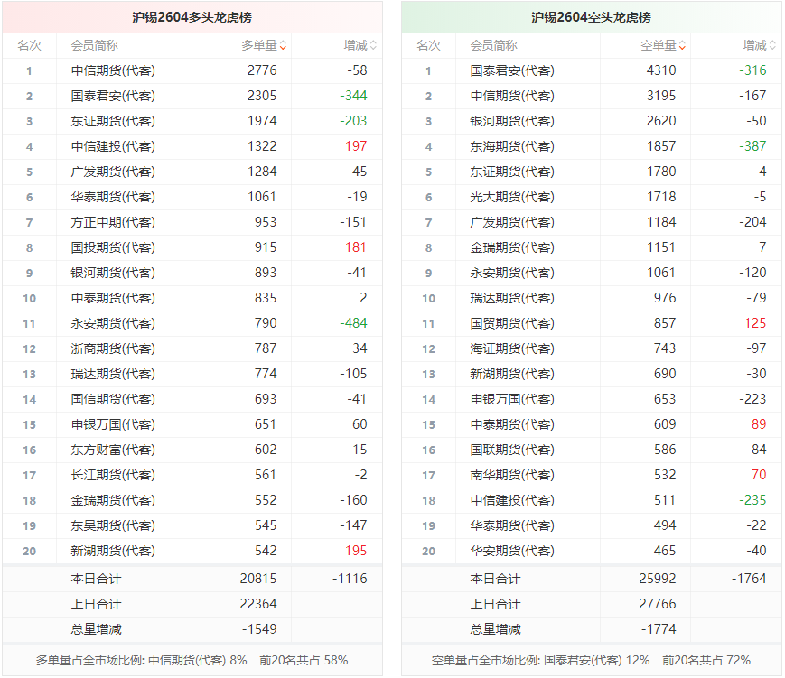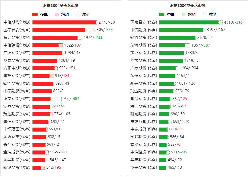 总体而言,沪锡2604合约今日减仓下行,多空持仓排名前20席中,多空双方均呈退场态势,多头退场意愿弱于空头。